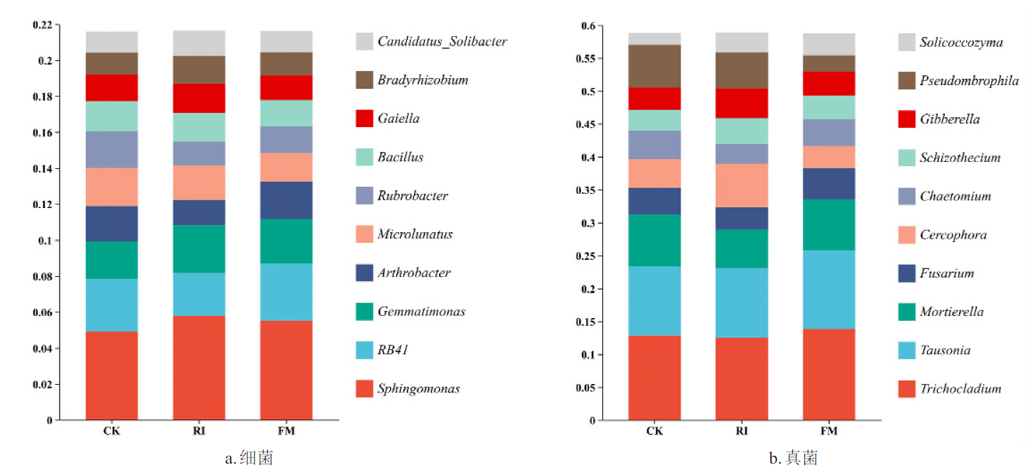 连作障碍现象严重制约紫苏的产量和质量。为探究不同丛枝菌根真菌(AMF)对紫苏连作障碍的缓解效果,通过向连作土壤中分别添加丛枝菌根真菌(AMF)根内根孢囊霉(RI)和摩西管柄囊霉(FM),测定紫苏地上生长指标,结合土壤理化性质、土壤酶活性及微生物群落结构,探讨2种AMF对紫苏生长的影响。结果表明,添加2种AMF能显著提高土壤中有机质、全氮、全磷和全钾含量(P<0.05),提高土壤脲酶和磷酸酶活性,增加土壤微生物群落中有益菌丰度,连作土壤酸化趋势得到缓解,紫苏生长指标明显提高。2种AMF相比,RI在提高土壤酶活性方面影响更加明显,而FM改善土壤微生物群落结构的能力更强。研究阐明了2种AMF改善连作紫苏土壤的功能差异,为下一步筛选缓解紫苏连作障碍的微生物菌剂提供了理论依据。