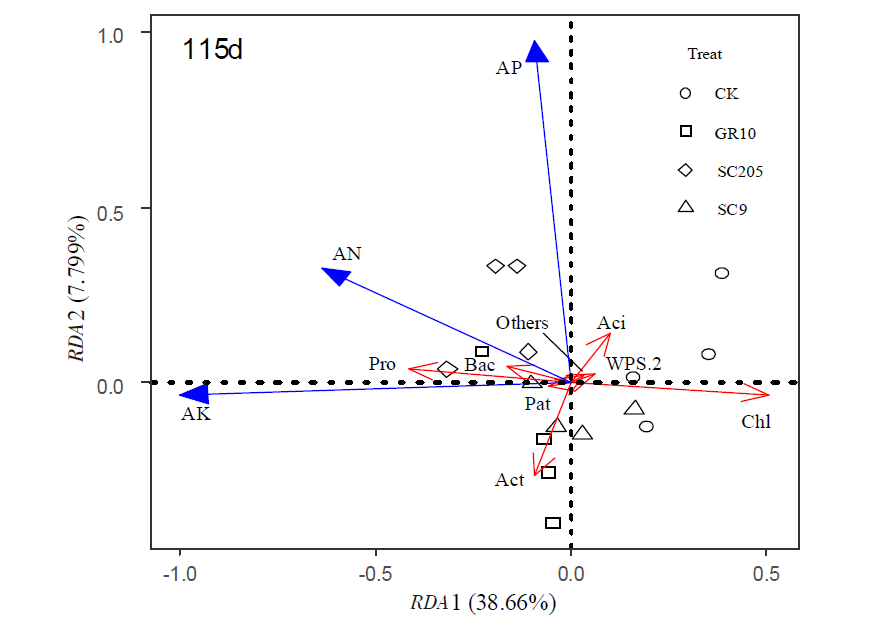 本研究旨在探讨不同木薯品种根际土壤细菌群落的动态变化特征。运用根袋法对‘华南205’(‘SC205’)、‘桂热10号’(‘GR10’)和‘华南9号’(‘SC9’)在种植后39、75、115 d这3个时间节点的根际土壤速效氮(AN)、速效磷(AP)、速效钾(AK)含量以及微生物群落差异展开研究。研究结果显示:(1)3个木薯品种的根际土壤速效养分含量在不同采样时间存在显著差异,仅速效钾(AK)含量在种植后39 d时存在品种间的显著性差异。(2)不同木薯品种以及不同采样时期的根际细菌丰富度和多样性均表现出显著性差异,且细菌的丰富度和多样性随着采样时间的推移呈增加趋势。(3)‘SC205’根际土壤在种植后75、115 d时,均富集变形菌门-α-变形菌纲和γ-变形菌纲、拟杆菌门-拟杆菌纲;在种植后39 d时,‘SC205’根际土壤富集γ-变形菌纲;而‘GR10’根际土壤在种植后75、115 d时富集放线菌门。(4)在种植后115 d时,土壤速效磷(AP)、速效氮(AN)含量与变形菌门、拟杆菌门呈正相关关系,与绿弯菌门呈负相关关系;土壤速效钾(AK)含量与放线菌门、髌骨细菌门呈正相关关系,与酸杆菌门、WPS-2呈负相关关系。综上所述,‘SC9’、‘GR10’和‘SC205’根际土壤中的微生物群落以放线菌门、变形菌门、拟杆菌门等富营养型细菌为主,且3个木薯品种根际细菌的丰富度和多样性存在品种差异并随季节变化。
