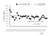 为了研究气候变化对日喀则春青稞生长发育的影响,利用日喀则1992—2022年春青稞生长季(4—9月)气象数据及春青稞发育期站点观测资料,采用统计方法、一元线性回归法、相关性分析及M-K检验法等对日喀则春青稞生育期气温、降水量及日照时数的年际变化特征及气象因子对春青稞生长发育期的影响进行研究。结果表明:(1)近31 a来,日喀则春青稞生长季年气温逐年呈升高趋势,平均每10 a升高0.57℃,与当地年平均气温相比升高趋势更加明显;生长季年平均降水量为422.8 mm,年平均降水量为430.6 mm,均呈弱较少趋势,主要降水集中在春青稞生长季内,占年均总降水量的90%以上,利于满足春青稞主要发育关键期的需水;生长季平均日照时数为1560.4 h,逐年呈弱减少趋势,平均每10 a减少15.8 h,未通过著性检验。(2)日喀则春青稞全生育期平均为118 d,并逐年呈缩短趋势,平均每10 a缩短3.99 d,生育期缩短代表发育进程加快,对产量和品质有一定影响;(3)春青稞全生育期的天数减少主要由4个生育期造成,出苗—三叶期、拔节—孕穗期、孕穗—抽穗期、开花—乳熟期生育期天数呈延长趋势,延长率分别为0.11 d/10a、1.58 d/10a、0.73 d/10a、5.33 d/10a,其中出苗—三叶期延长天数最为不明显;春青稞全生育期的天数减少主要由5个生育期造成,播种—出苗期、三叶—分蘖期、分蘖—拔节期、抽穗—开花期、乳熟—成熟期生育期天数呈缩短趋势,缩短率分别为0.73 d/10a、2.60 d/10a、1.53 d/10a、1.06 d/10a、7.22 d/10a,其中乳熟—成熟期缩短速率最大,三叶—分蘖期次之;生育期天数缩短对产量形成不利,尤其是乳熟—成熟期缩短会导致灌浆不足、籽粒干瘪,从而影响产量和品质。研究成果可为当地政府部门提供决策依据,为西藏高原未来特色农业可持续发展和粮食安全保障提供科学依据。