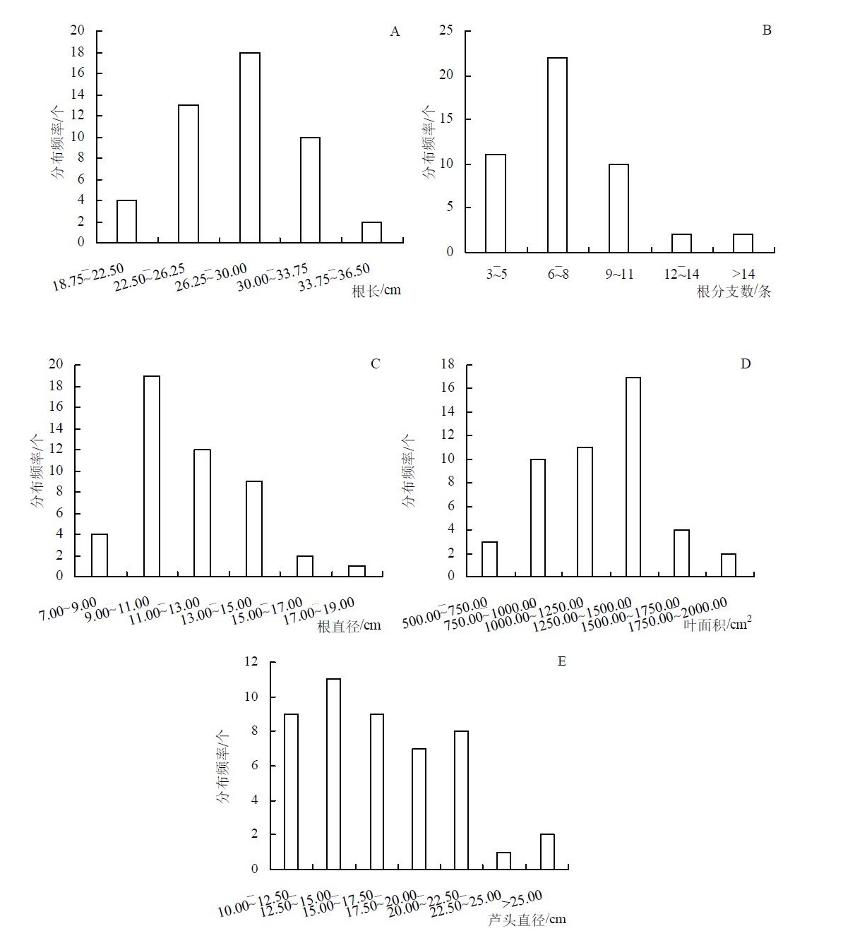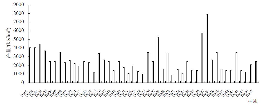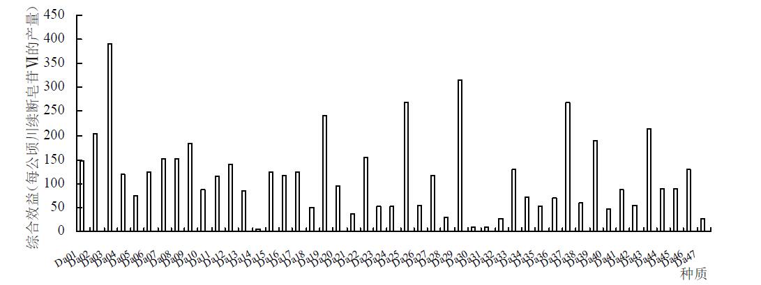 良种缺乏是限制川续断种植业发展的瓶颈问题。本研究收集云南及周边地区的野生与栽培川续断植株,旨在筛选优质种源,明确自然群体中白色花药与紫色花药2种类型植株的分布比例及农艺性状差异,为川续断良种选育与品质调控提供理论依据。以47份不同来源的川续断种质资源为材料,将其种植于保山市农业技术推广中心川续断种植资源圃,采用随机区组设计开展试验;测定株高、根直径、叶面积等12项农艺性状,结合HPLC法测定川续断皂苷Ⅵ含量,采用方差分析与相关性分析等方法进行数据处理,系统评价种质资源优劣及花药颜色关联性状差异。结果显示,川续断芦头直径与根长、根分支数、根直径和叶面积呈极显著正相关(P<0.01),其中与叶面积相关性最强(r=0.738);47份种质中,Da03(产量4466.40 kg/hm2,皂苷含量8.75%)、Da29(产量3447.45 kg/hm2,皂苷含量9.15%)、Da25(产量3489.45 kg/hm2,皂苷含量7.73%)具有高产高含潜力,Da37(产量7955.85 kg/hm2,皂苷含量3.36%)为高产低含关键育种材料;自然群体中紫色花药植株占比84%,白色花药植株占16%,前者川续断皂苷Ⅵ含量(5.42%)显著高于后者(3.94%,P<0.05),后者花序长(30.70 cm)、花序宽(30.54 cm)显著大于前者(P<0.05)。研究明确了川续断优质种质的核心筛选指标与花药颜色关联的性状特征,筛选出的优良种质可为川续断高产优质品种选育提供亲本材料,花药颜色标记为快速评价种质品质提供了直观依据,对推动川续断人工种植产业化与野生资源保护具有重要实践意义。
