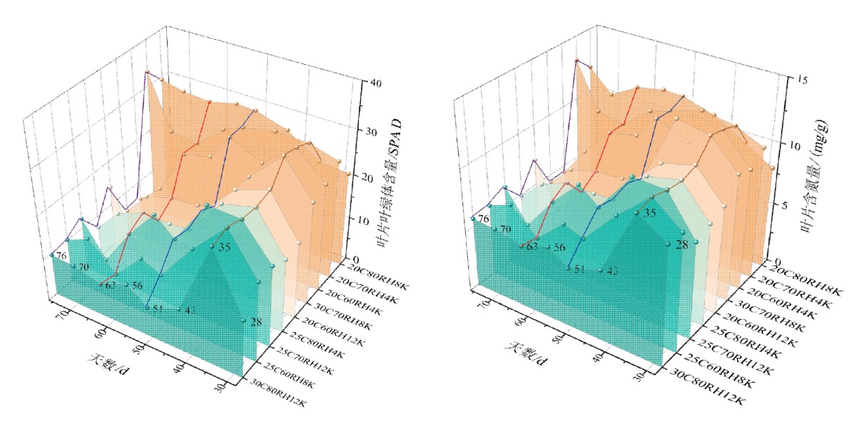To investigate the dynamic changes and adaptive control mechanisms of sensitive periods in plants in deep underground environments, Nicotiana benthamiana was used as a model to study its environmental response mechanisms. An orthogonal experimental design was implemented to regulate light intensity (4000-12000 Lux), temperature (20-30℃), and humidity (60-80% RH). Growth and physiological parameters including plant height and leaf area were quantitatively measured, and environmental sensitivity characteristics were analyzed using principal component analysis (PCA). The cycle of Nicotiana benthamiana could be divided into germination-rapid growth period (1-14 d), rapid growth-stable period (15-62 d) and stable-mature period (63-76 d). PCA analysis showed that PC1-PC2 cumulatively explained 58.6% of the variation, of which PC1 (44.90%) was mainly related to light intensity and leaf area, and PC2 (13.70%) was mainly related to soil redox potential (Eh) and temperature. Plants were highly sensitive to the environment in the early stage of growth (1-62 d), especially to light and temperature. The average daily plant height growth in the 12000 Lux group was 4.82 ± 0.15 mm, which was 17.0% higher than that in the 8000 Lux group. The environmental sensitivity transition point occurred on day 63rd, marking a shift from environment-dependent growth to physiology-regulated growth. Optimized cultivation conditions of 20℃-25℃, 70%-80% RH, and 8000-12000 Lux significantly enhanced photosynthetic efficiency and nitrogen assimilation capacity. Under this condition, the photosynthetic-nitrogen metabolism coupling efficiency of the plant was the best, the chlorophyll content was 28.3% higher than that of the 30℃/60% RH/4000 Lux control group, and the nitrogen assimilation capacity was increased by 31.5%. This study revealed plant adaptation mechanisms in extreme environments, providing theoretical insights for environmental regulation in deep subsurface plant cultivation and advancing foundational theories for deep underground agriculture.