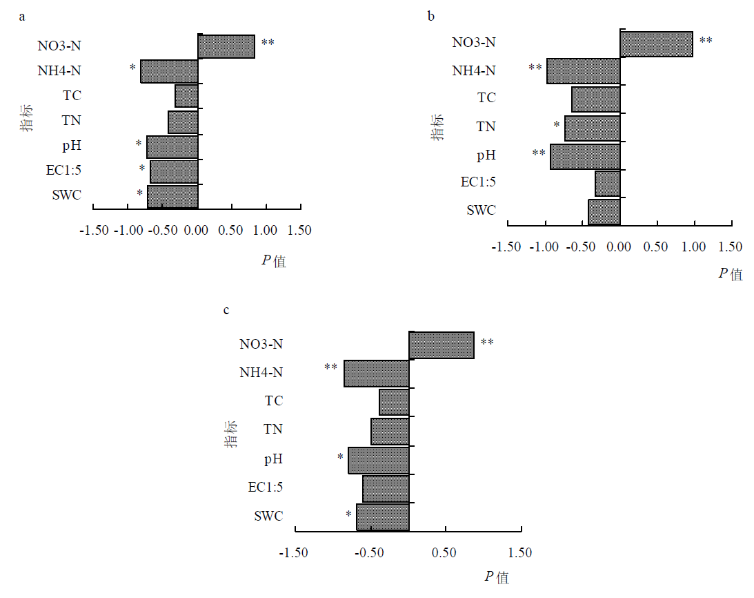 | 铵态氮 | 0.084 | 0.375 | -0.772* | 0.386 |