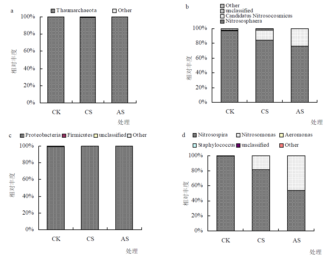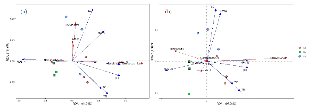 新疆干旱区盐碱地面积大、分布广,其特殊的理化属性导致土壤肥力状况低下,且盐基离子会干扰氮素转化。目前,盐碱环境对氨氧化细菌等硝化关键微生物的影响尚不明确,制约了对该区域氮素转化机制的深入研究及盐碱地改良工作的开展。本研究通过土柱模拟试验,旨在探究NaCl和Na2CO3+NaHCO3胁迫对干旱区灰漠土土壤氨氧化古菌(AOA)和氨氧化细菌(AOB)群落多样性的影响。试验设置了非盐(碱)化(CK)、中度盐化(CS)和中度碱化(AS) 3个处理,评估了盐碱胁迫对棉花生长、土壤理化性质以及AOA和AOB的丰度和群落结构的影响。结果表明:盐碱胁迫显著降低了棉花株高和干物质重、土壤NO3-N含量和潜在硝化速率(PNR);然而,土壤含水量、盐分、pH和NH4-N含量显著增加。与对照组相比,盐碱胁迫处理AOA和AOB的基因拷贝数均显著降低,且AOA/AOB比值也显著降低。此外,在所有处理下,AOB的基因拷贝数均显著高于AOA。PNR与AOA丰度和AOB丰度均呈显著正相关关系。不同处理下AOB群落操作分类单元(OTUs)的数量均显著高于AOA,碱胁迫显著降低了AOB群落的OTU数量,而盐胁迫显著降低了AOB群落的辛普森指数和香浓指数,碱胁迫显著增加了AOB群落的辛普森指数。盐胁迫显著降低了AOA和AOB的Pielou_e均匀度指数,碱胁迫显著降低了AOA和AOB的Chao1丰富度指数,但是显著增加了其Pielou_e均匀度指数。在门水平上,AOA群落的优势菌门为Thaumarchaeota;AOB群落的优势菌门为Proteobacteria;在属水平上,AOA优势菌属为Candidatus Nitrosocaldus和Nitrososphaera,AOB优势菌属为Nitrosospira和Nitrosomonas。盐碱胁迫显著增加了Candidatus Nitrosocaldus和Nitrosomonas的相对丰度,但是显著降低了Nitrososphaera和Nitrosospira的相对丰度。冗余分析显示:AOA群落结构的改变主要驱动因子为土壤含水量和pH,而AOB群落结构的改变主要驱动因子为pH。综上,AOA和AOB共同参与了灰漠土的硝化作用,土壤pH是影响其丰度、生长及群落结构的主导环境因子。