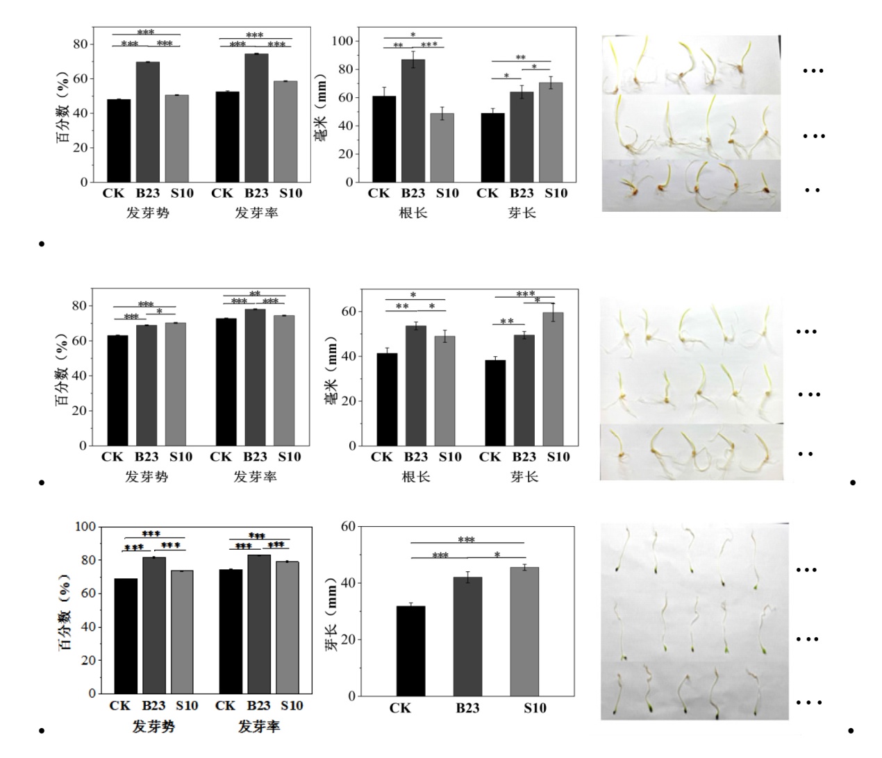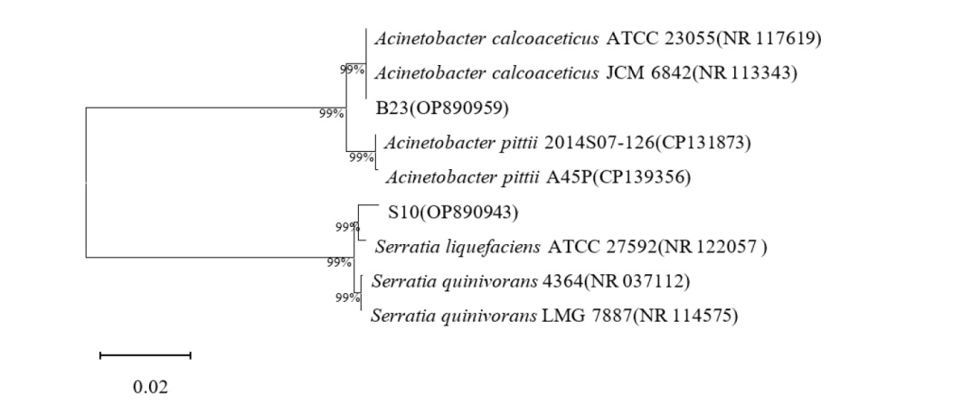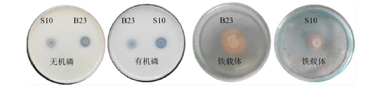 This study aims to investigate the biological characteristics of phosphate-solubilizing strains B23 and S10, optimize their cultivation conditions, and provide basic data for exploring the phosphate-solubilizing mechanism and preparing phosphate-solubilizing bacterial fertilizers. The Salkowski colorimetric method and the phenol-sulfuric acid method were used to quantitatively determine the strain's IAA production and exopolysaccharide production; single-factor level experiments were adopted to optimize phosphate-solubilizing culture conditions for strains; the colorimetric method was used to determine phosphatase and glucose dehydrogenase in strains; and the effects of the strains on the germination of Avena sativa, Triticum aestivum, and Medicago sativa seeds were investigated through pot experiments. The results indicate that both S10 and B23 have the abilities to produce IAA, dissolve organophosphorus, produce siderophores, produce HCN, and produce exopolysaccharide, with IAA yieds of 18.875 mg/L and 7.603 mg/L respectively; exopolysaccharide yields of 16.290 μg/mL and 16.941 μg/mL respectively,S10 also has the ability to produce NH3. 16S rRNA gene sequence analysis indicates that they belong to the Serratia and Acinetobacter, respectively. The strain exhibits the strongest phosphate-solubilizing effect when the carbon and nitrogen sources are sucrose and urea, with the optimal initial pH values being pH 6.0 and pH 7.0, respectively. Compared with before optimization, the activities of alkaline phosphatase, acid phosphatase, and glucose dehydrogenase in S10 were increased by 33.97%, 47.20%, and 20.94%, respectively; in B23, they were increased by 12.47%, 99.19%, and 54.63%, respectively. Both B23 and S10 can significantly improve the germination vigor, germination rate, and sprout length of Avena sativa, Triticum aestivum, and Medicago sativa. They also have a significant promoting effect on the root length of Avena sativa and Triticum aestivum. The above results indicate that strains S10 and B23 have strong phosphate-solubilizing abilities and multiple plant growth-promoting potentials. They can promote seed germination and may serve as candidate strains for preparing phosphate-solubilizing bio-fertilizers.
