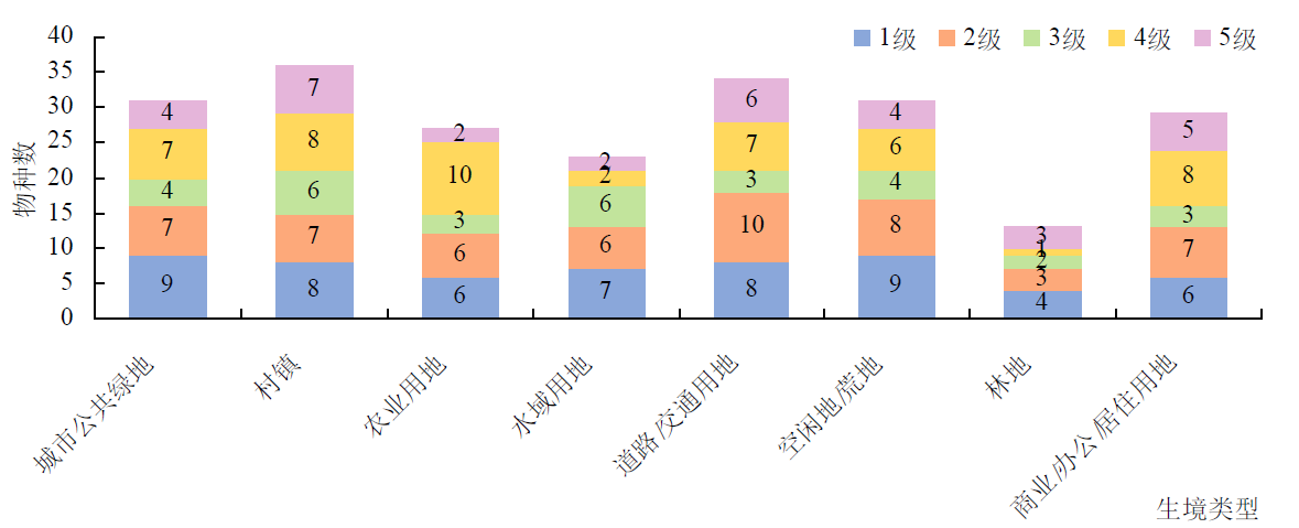 本研究旨在剖析云南省安宁市不同生境类型下外来入侵植物的构成及分布规律,以期为当地外来入侵植物的防治提供科学依据。研究以安宁市12种土地利用类型、18种生境类型为调查对象,于2022—2025年采取全面踏查法、样线法进行外来入侵植物实地调查,查阅文献资料研究安宁市外来入侵植物的组成与分布特征。结果表明,安宁市共有外来入侵植物94种,隶属于31科70属,其中菊科(22种)、豆科(10种)、禾本科(8种)为优势科,种类最多的属为飞蓬属(4种)、苋属(4种)。原产地分析结果显示,65种外来入侵植物来自美洲,占物种总数的56%。引入途径分析结果显示,65种是有意引入,占比69.1%。植物区系分析结果显示,安宁市入侵植物的科、属均表现出显著的世界广布与热带分布特征。从入侵等级来看,处于恶性入侵种(1级)、严重入侵种(2级)、局部入侵种(3级)的物种数分别为16、16、10种。在空间分布方面,连然街道(36种)与县街街道(36种)入侵植物种数最多,太平新城街道次之(31种)。安宁市18种生境类型中,都有外来入侵植物分布,其中,出现频次最高的生境类型是道路/交通用地,占总频次的16.39%;村镇、空闲地/荒地、商业/办公/居住用地、农业用地、城市公共绿地等5类生境也较多,占比均超过总频次的10%。分析显示,8类生境的外来入侵植物丰富度存在显著差异(P<0.01),村镇显著高于其他生境,林地最低。各生境外来入侵植物物种数及等级分布差异显著,村镇物种数最多(36种)且高危害等级(1~2级)占比也较高,林地物种数最少(13种)且各等级占比均最低,道路/交通用地、空闲地/荒地1~2级占比均超过50%;城市公共绿地、商业/办公/居住用地以1~2级为主;农业用地、水域用地较其他生境入侵程度轻。研究表明,安宁市外来入侵植物在不同地理区域与生境类型间呈现显著的分布异质性,本研究成果可为制定精准化、差异化的防控策略提供关键数据支持。