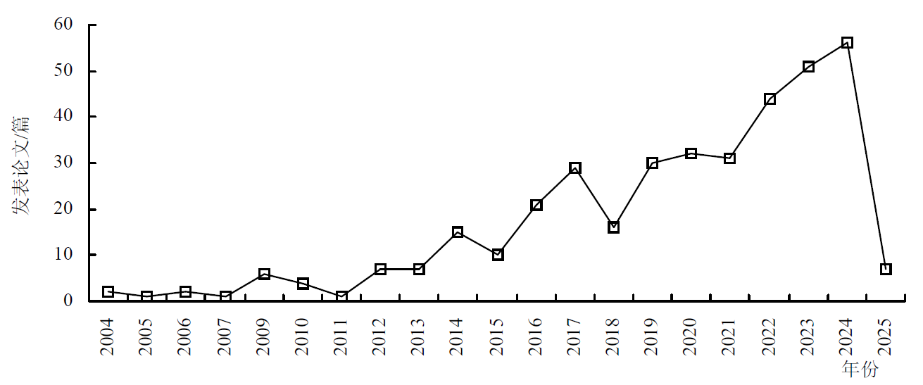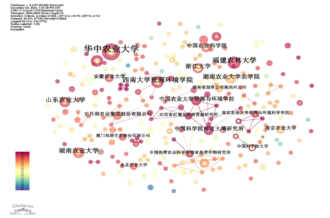 针对土壤酸化加剧威胁农业生产的问题,为系统梳理国内土壤酸化调控研究现状与趋势,基于CNKI数据库2004—2024年关于土壤酸化调控策略的386篇中文核心文献,采用CiteSpace6.4R1软件,从年度发文量、研究机构、作者合作、关键词聚类等维度开展文献计量分析。结果显示,(1)该研究领域的发展趋势分为3个阶段:2004—2015年缓慢增长,2016—2021年平稳波动,2022—2024年快速发展;(2)机构与作者合作呈现“局部集中、整体分散”格局,华中农业大学(18篇)、福建农林大学(9篇)为核心研究机构,作者合作以小规模集群为主,整体协作性较弱;(3)关键词聚类形成“生石灰改良”“生物炭应用”“秸秆还田”“微生物调控”等14个核心主题,近年“生物炭”“微生物菌剂”“钙镁肥”成为突现热点。国内土壤酸化调控研究已实现从单一化学改良向“化学-有机-生物”联合调控的范式转型,研究聚焦与不同酸化土壤特性适配的技术路径与作物种植模式,为中国土壤酸化精准治理、耕地质量保护及农业可持续发展提供了重要的文献计量参考与技术支撑。