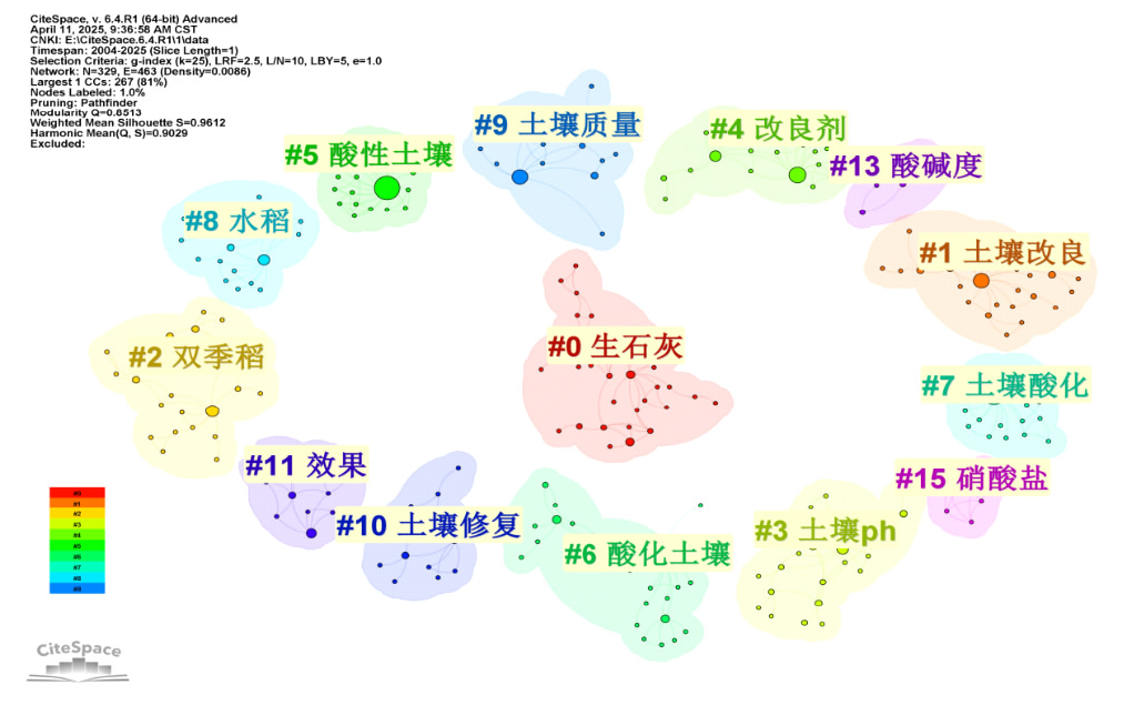 Key words: quicklime, amendment, biochar, straw incorporation, microbial agent, calcium-magnesium fertilizer, CiteSpace, bibliometrics