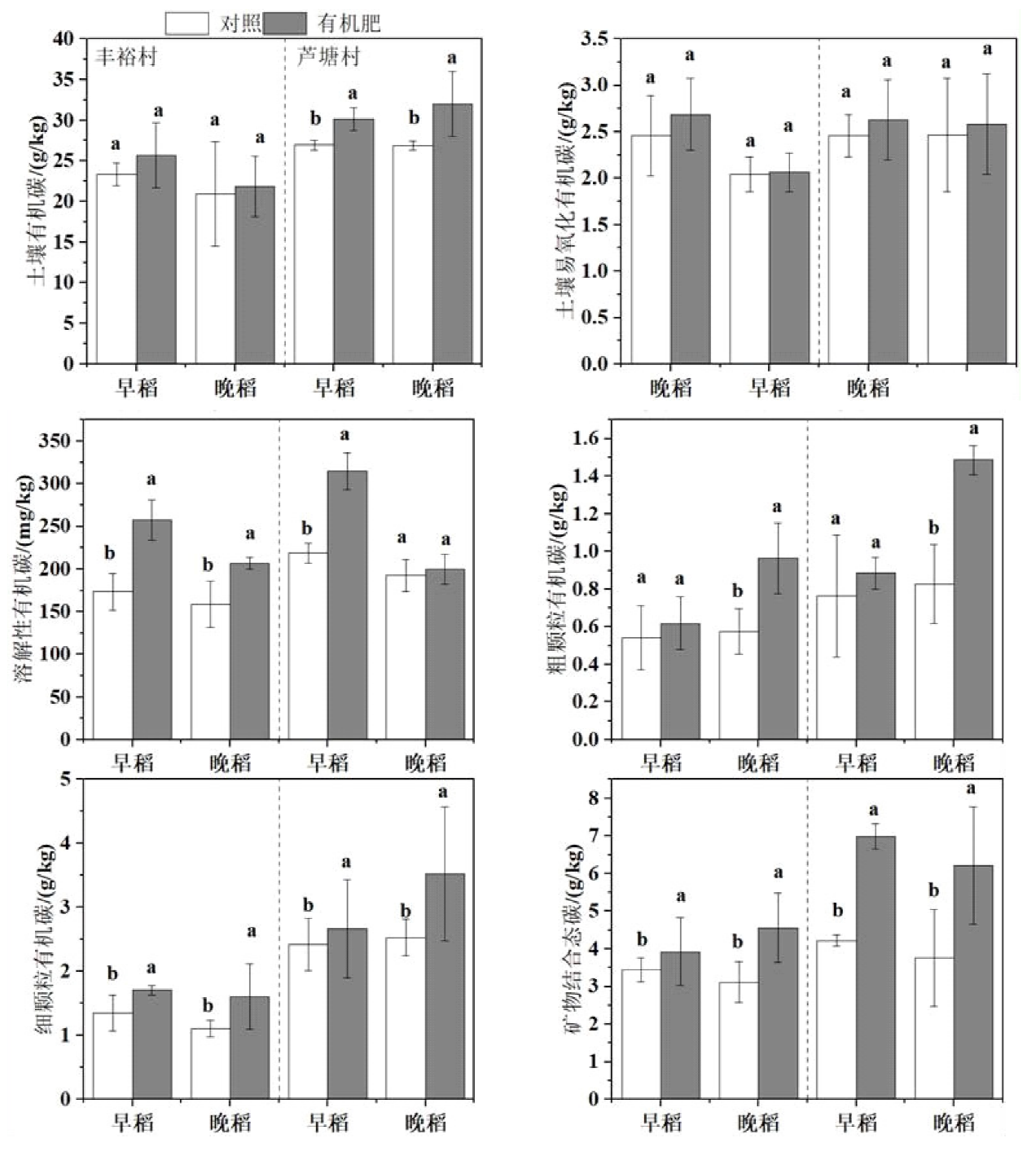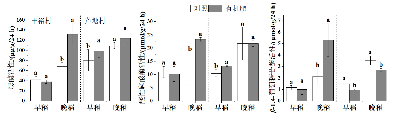 为探究鸡粪发酵商品有机肥施用在双季稻种植模式中对水稻产量及土壤理化性质的调控作用,本研究于湘东浏阳市某河砂泥田开展大田配对试验,设置施常规化肥(CK)与鸡粪发酵商品有机肥4.50 t/(hm²·季)处理,系统分析了连续施用有机肥对水稻产量、土壤理化性质及酶活性的影响。结果表明,与对照田块相比,施有机肥处理虽未显著提高双季稻产量(增幅介于11%~15%),但显著改善了土壤物理结构:早稻季土壤容重降低15%~16%,土壤团聚体稳定性显著提高21%~61%(P<0.05)。土壤各碳组分含量均有增加趋势,芦塘村早、晚稻季土壤总有机碳含量分别显著提高12%和19%,活性有机碳组分含量(溶解性有机碳、颗粒有机碳)增幅达29%~67%,矿物结合态有机碳含量提升14%~65%。速效养分含量的增幅呈现时空异质性:芦塘村早稻季全氮和碱解氮含量分别显著增加26%和21%,丰裕村晚稻季碱解氮和速效钾含量分别提升21%和11%(P<0.05)。土壤酶活性对有机肥施用的响应因试验地点与稻季而异,丰裕村晚稻季脲酶、酸性磷酸酶和β-1,4-葡萄糖苷酶活性显著提高93%~149%,而芦塘村早、晚稻季β-1,4-葡萄糖苷酶活性降低23%~35%。相关分析表明,水稻产量与土壤有机碳、速效钾及矿物结合态碳含量呈显著正相关(Pearson相关系数为0.420~0.634),但与β-1,4-葡萄糖苷酶活性呈显著负相关(Pearson相关系数为-0.506)。综上,鸡粪发酵商品有机肥通过改善土壤物理结构、提高土壤有机碳含量及酶活性,对双季稻区地力培育具有正向积极作用,但其效果受土壤本底及稻季的影响。