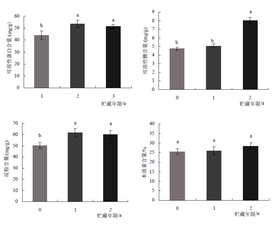 本研究旨在探究室温贮藏年限对野生型箭筈豌豆(Vicia sativa L.) 种子萌发特性及生理生化特征的影响规律。选取贮藏0~2 a的种子为实验材料,综合分析其萌发指标动态变化、种皮元素组成、营养物质含量、抗氧化酶活性及丙二醛(MDA)积累特征。结果显示:(1)随贮藏年限增加,种子硬实率显著(P<0.05)下降;贮藏2 a时发芽率(98.52%)与发芽势(97.43%)达峰值,种皮颜色由灰转变为红褐色。(2)种皮钙(3911.64 μg/g)和铝(18.09 μg/g)含量显著下降(P<0.05),而钾(5152.93 μg/g)、铁(92.92 μg/g)、锰(37.43 μg/g)含量显著上升。(3)过氧化氢酶(CAT)活性呈先升高后降低趋势,贮藏1 a时最高(346.76 μmol/g);过氧化物酶(POD)活性显著下降(P<0.05),贮藏2 a时达最低值(232.00 U/g);超氧化物歧化酶(SOD)活性总体下降(贮藏0 a最高,463.03 U/g);丙二醛(MDA)含量显著上升(P<0.05),贮藏2 a达峰值(9.04 nmol/g)。(4)可溶性蛋白与淀粉含量先升高后略降低,贮藏2 a时达最低值(分别为51.43 mg/g和60.02 mg/g);可溶性糖含量持续上升,贮藏2 a最高(8.05 mg/g);种皮木质素含量无显著变化(P>0.05)。(5)相关性分析显示,发芽势、发芽率及MDA含量与硬实率呈显著负相关(P<0.05),与种皮颜色呈显著正相关(P<0.05)。综上所述,室温贮藏2 a的野生型箭筈豌豆种子活力强,是理想的播种材料。