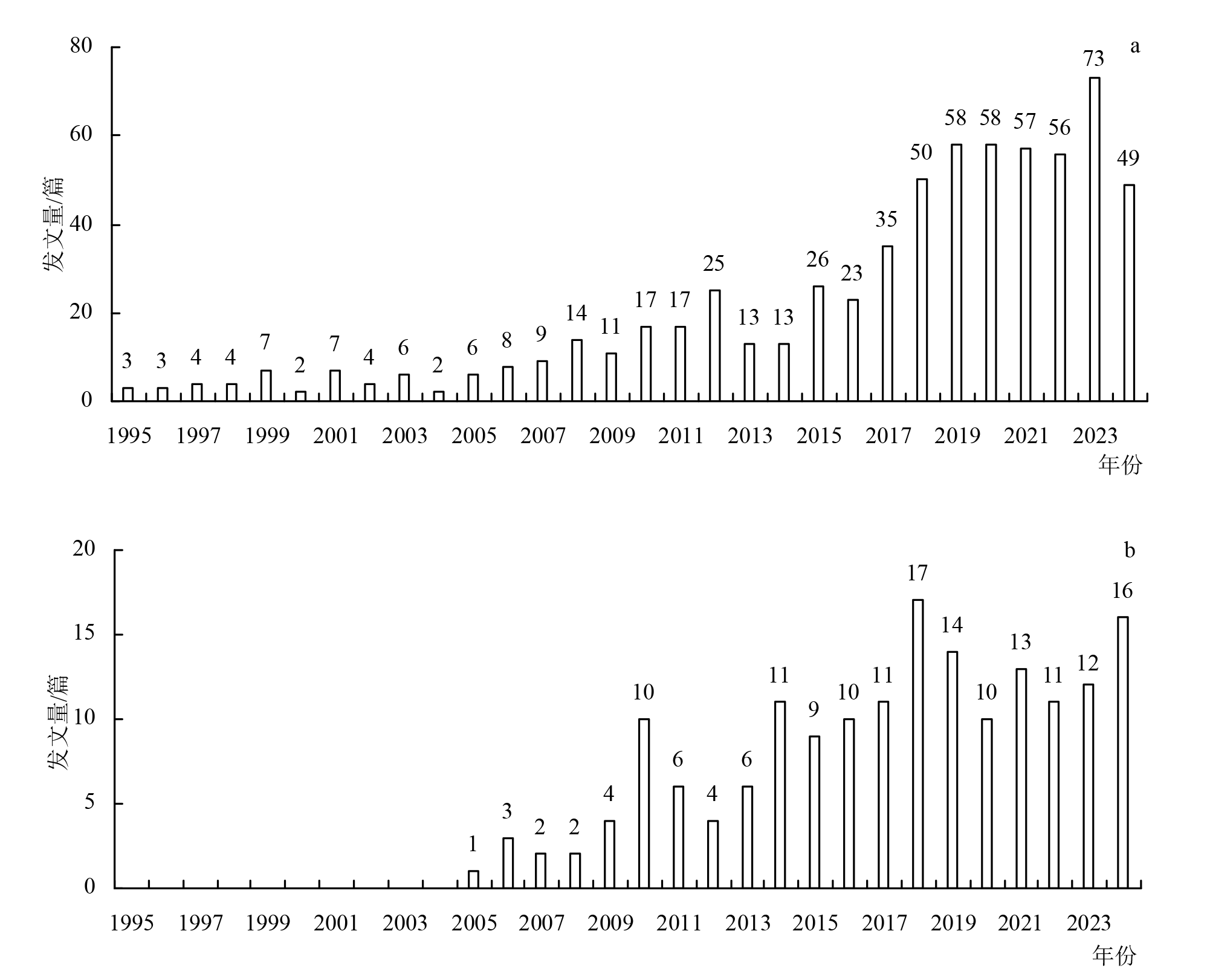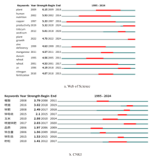 针对全球以小麦为主食人群面临膳食锌摄入不足,且小麦籽粒锌研究缺乏系统梳理的问题,为明确该领域研究现状与热点,基于中国知网(CNKI,172篇)和Web of Science核心合集(660篇)1995—2024年文献,采用CiteSpace和VOSviewer进行文献计量可视化分析,分析发文量前10位的国家、机构、期刊,被引频次前10位的文献及作者,通过关键词共现、聚类及时序演化挖掘研究热点,探究发文趋势、核心贡献者、研究热点及时序演化、国际合作网络。结果表明:(1)1995—2024年全球小麦籽粒锌的研究文献刊发数量呈上升趋势,澳大利亚、美国、中国和巴基斯坦在发文量与被引频次方面领先于其他国家,中国发文量(180篇)居首;(2)中文研究则侧重于叶喷锌肥和籽粒品质,英文研究热点聚焦于重金属、农艺生物强化;(3)中文研究以2016年为节点,历经籽粒品质、植酸、锌含量、锌形态(2005—2016年)和籽粒锌吸收、新型锌肥、喷施锌肥、喷施方式(2016—2024年)2个阶段。英文研究以2015年为界,历经小麦微量元素、缺素症、小麦营养和产量、小麦生殖(1995—2015年)和小麦锌元素、锌肥使用方式、产量增长和小麦繁殖(2016—2024年)2个阶段;(4)国际合作网络中,与中国研究关系密切的核心国家为巴基斯坦、澳大利亚、美国、加拿大、土耳其;(5)中国在小麦籽粒锌研究领域发文量占优,但缺乏高质量、高影响力的权威性文献。研究明确了小麦籽粒锌研究的全球格局与热点演化规律,中国需加强国际合作提升研究影响力。未来可聚焦遗传育种与农艺措施协同、新型锌肥研发等方向,强化不同生态区针对性研究,为锌营养强化提供技术支撑。