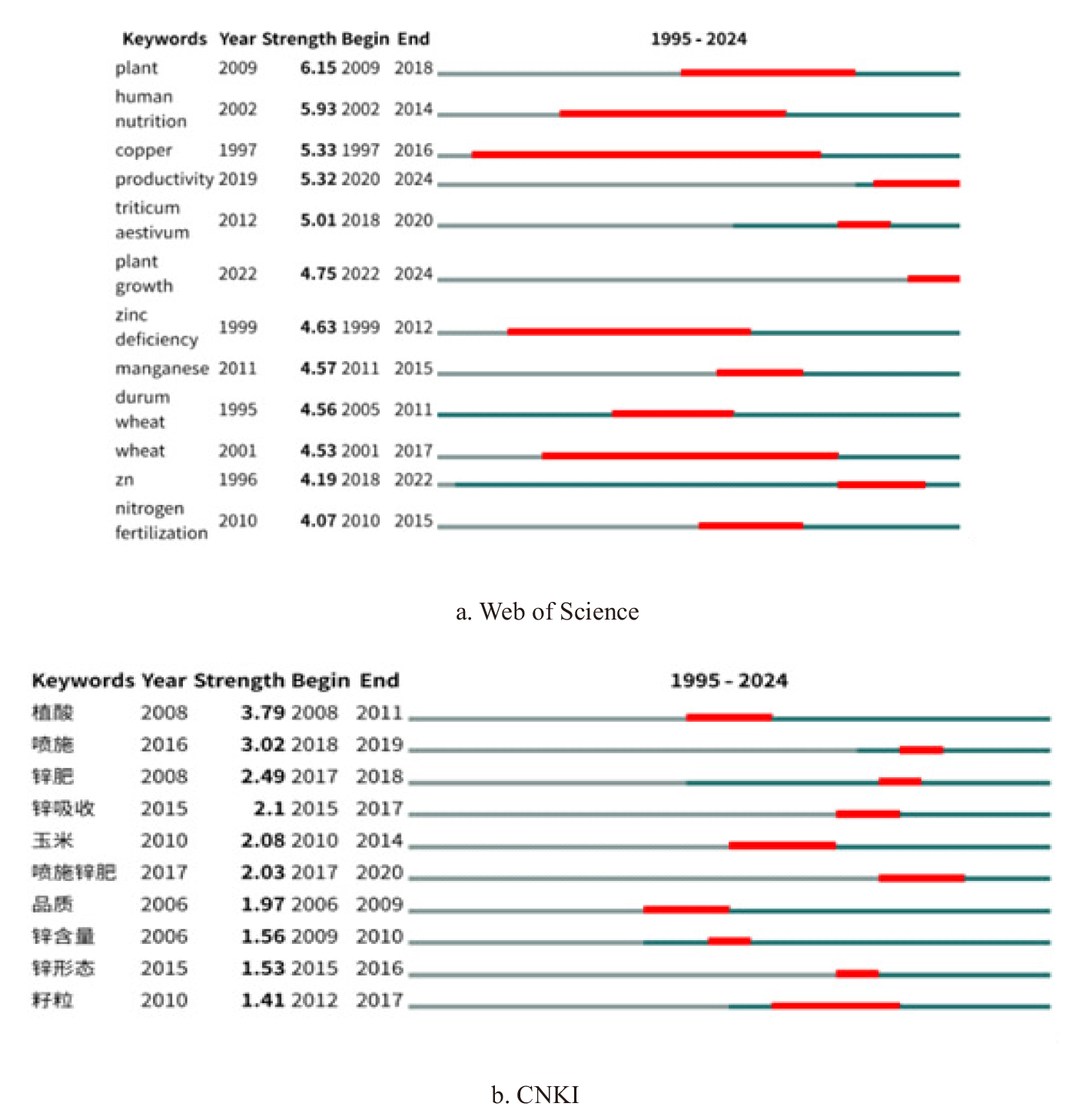 To address dietary zinc deficiency in populations dependent on wheat, publications related to wheat grain zinc and zinc fertilizers in the China National Knowledge Infrastructure (CNKI, 172 articles) and the Web of Science Core Collection (660 articles) from 1995 to 2024 were analyzed and visualized using CiteSpace and VOSviewer based on the bibliometric analysis. The study examined the top 10 contributing countries, institutions, and journals, as well as the top 10 most-cited publications and authors. Research hotspots were found by the keyword co-occurrence, cluster analysis, and timeline evolution, and international collaboration patterns were also identified. Results showed that English research focused on heavy metals and agronomic biofortification, whereas Chinese studies emphasized foliar zinc fertilization and grain quality. Timeline analysis revealed two phases in Chinese research: studies on grain quality, phytic acid, zinc concentration, and zinc speciation (2005-2016), followed by grain zinc uptake, novel zinc fertilizers, and zinc spray application methods(2016-2024). Similarly, English research early interested in wheat micronutrients, deficiency symptoms, nutrition, yield, and reproduction (1995-2015), and then concentrated on wheat zinc, zinc fertilizer application methods, yield enhancement, and reproduction (2016-2024). Pakistan, Australia, the United States, Canada, and Turkey were connected closely with China in the international collaboration network. From 1995 to 2024, global publication about wheat grain zinc was increased gradually, the publication and citation impact were obvious lead in Australia, the United States, China, and Pakistan. Although China produces a high number of publications in this field, it lacks high-impact, authoritative studies. Strengthening international research collaboration is efficiency to enhance the quality and influence for the future work.