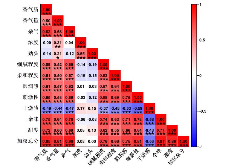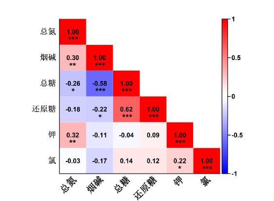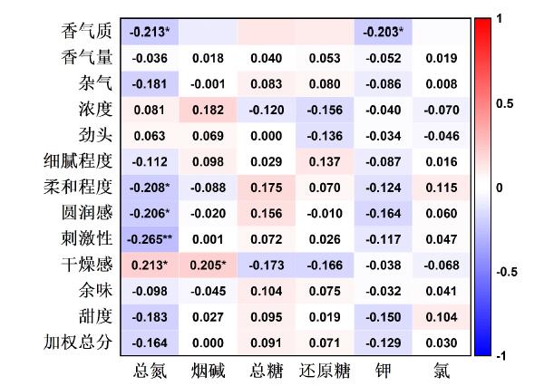 Key words: southern Anhui tobacco-growing area, middle tobacco leaves, chemical components, sensory quality, correlation analysis