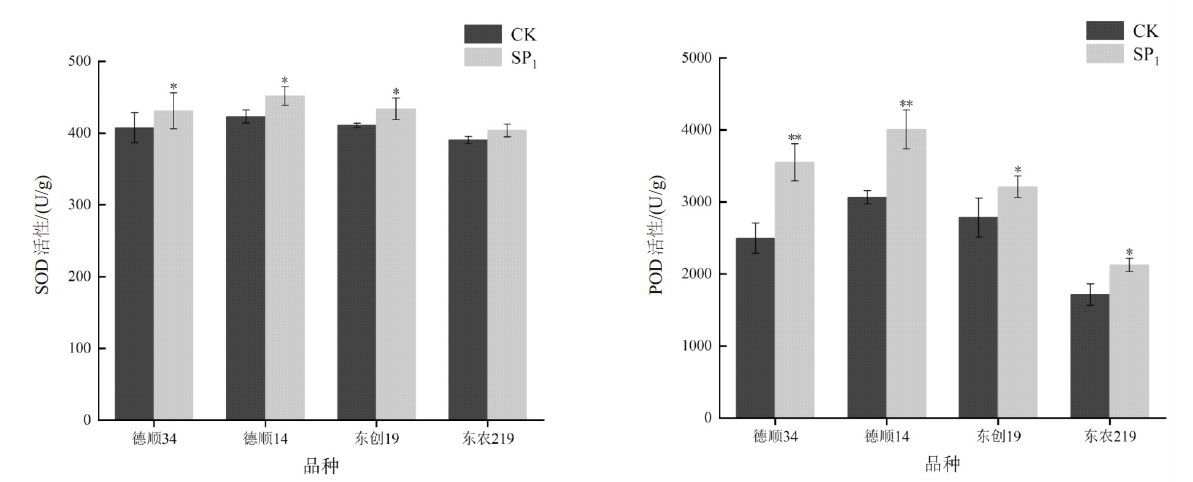 本研究旨在探究航天诱变对不同大豆品种生理指标及抗氧化酶活性的影响,为大豆种质创新与品种选育提供理论依据,同时推动航天诱变育种技术在豆科作物遗传改良中的深入应用。实验以“实践十九号”卫星搭载的4种优良大豆种子为研究对象,经航天诱变处理后返回地面进行SP1代地面种植,未经搭载的大豆种子为CK,对其生长性状、光合指标、抗氧化酶及可溶性蛋白含量进行了测定和分析。结果表明:‘德顺34’、‘东创19’发芽率较CK分别提高13.2%、17.6%,‘东创19’发芽势较CK提高9.4%;‘德顺14’叶长较CK降低8.9%,‘东农219’叶宽较CK下降28.0%;‘德顺34’株高较CK提高5.19%,‘德顺34’、‘德顺14’、‘东创19’株幅较CK分别降低53.2%、54.7%、56.3%,‘东创19’节间长较CK提高10.8%,‘东农219’分枝数较CK降低28.0%;‘东农219’单株荚数较CK提高7.7%。‘德顺14’净光合速率较对照提高17.3%。‘德顺34’、‘德顺14’POD活性较CK均有所提高;‘德顺14’MDA含量极显著高于CK;‘东创19’可溶性蛋白含量较CK极显著提高。综上所述,航天诱变导致大豆植株性状发生广泛变异,尤以株幅变化最为突出;光合指标有所改善,抗氧化酶活性及可溶性蛋白含量波动较大,其中SOD变化最小,且这些变异在不同品种间表现出差异性。