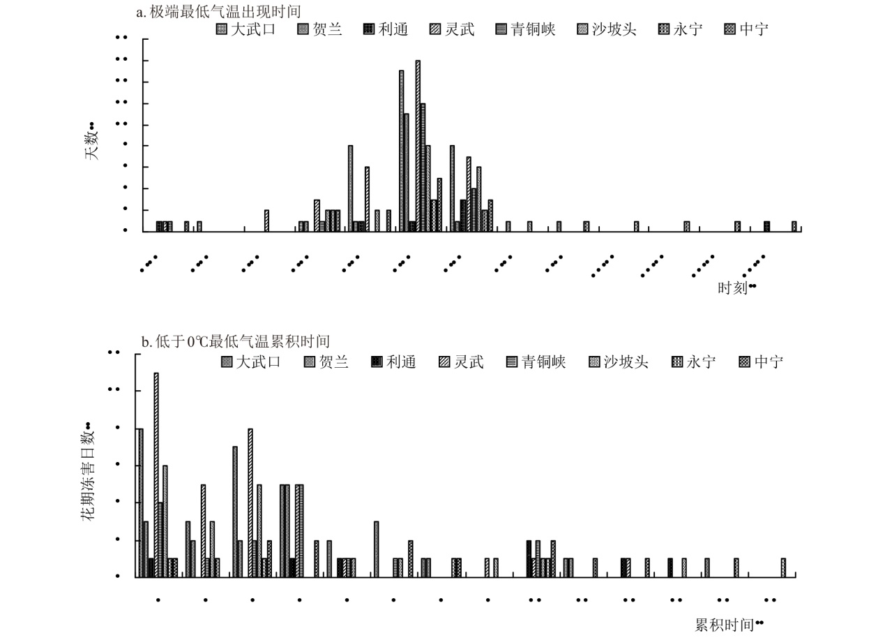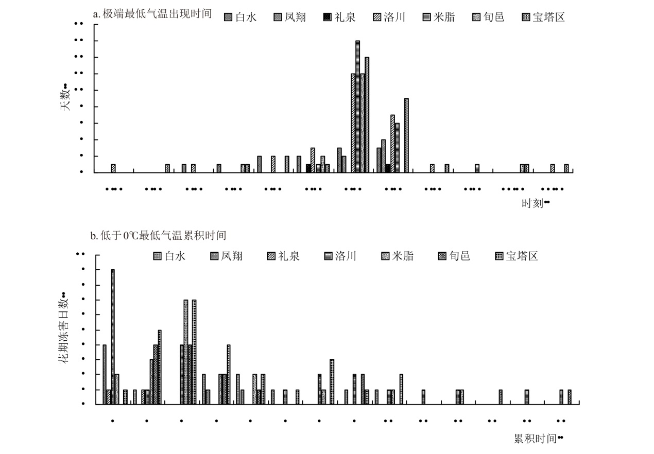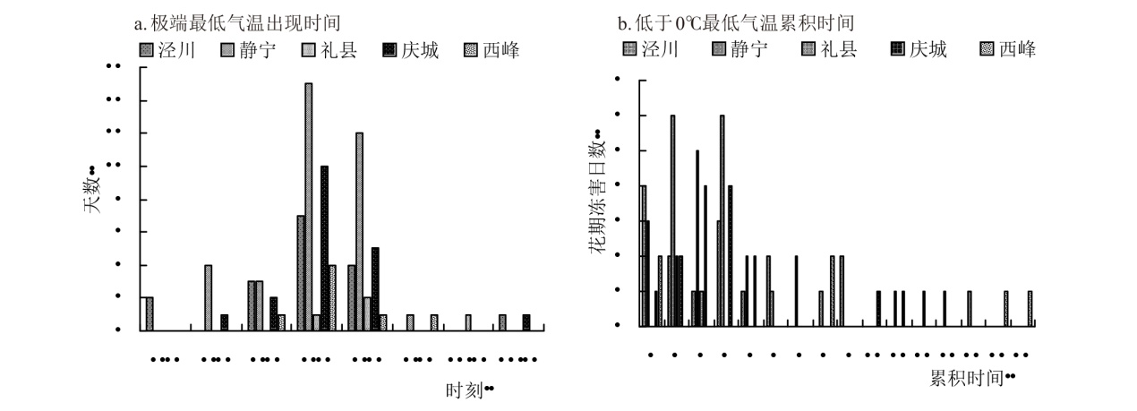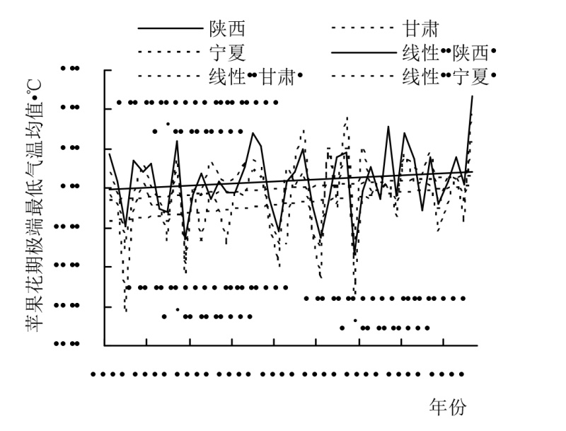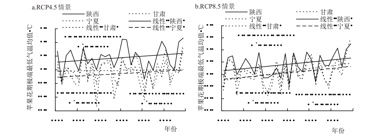 为揭示陕甘宁地区苹果开花期极端最低气温过去及未来变化特征,为陕甘宁地区苹果花期冻害预警和防御提供科学依据,本研究利用陕西、甘肃、宁夏苹果种植区21个代表县气象站1981—2024年4月逐日、逐时气温数据,及RCP4.5和RCP8.5 2种温室气体排放气候情景下4月逐日最低气温数据,基于线性倾向估计法、Mann-Kendall趋势检验、频率指数等方法,分析过去和未来气候情景下苹果开花期极端低温变化特征及冻害频率指数。结果表明,1981—2024年陕甘宁大部代表县区苹果开花期极端最低气温呈上升趋势,宁夏利通、甘肃西峰极端最低气温在20世纪90年代发生突变,陕西花期冻害频率最低,宁夏最高;花期冻害过程中最低气温主要出现在4:00—7:00,累积时间1~4 h。未来气候情景模式下,开花期极端最低气温仍呈上升趋势,RCP8.5情景下升温更明显且苹果花期冻害频率较过去44 a降低,甘肃、宁夏低排放情景下花期冻害频率高于高排放情景。研究表明,未来高排放气候情景模式下陕甘宁苹果花期冻害风险降低,但仍需综合考虑低温强度、持续时间等因素的综合影响。花期冻害过程中最低气温出现时间和持续规律,有利于选择苹果花期冻害防御最佳时机,提高防御效果。