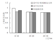 | 落叶松纯林 | 0~10 | 0.88 | 37.06 | 46.49 | 38.42 |