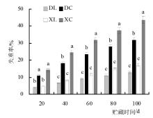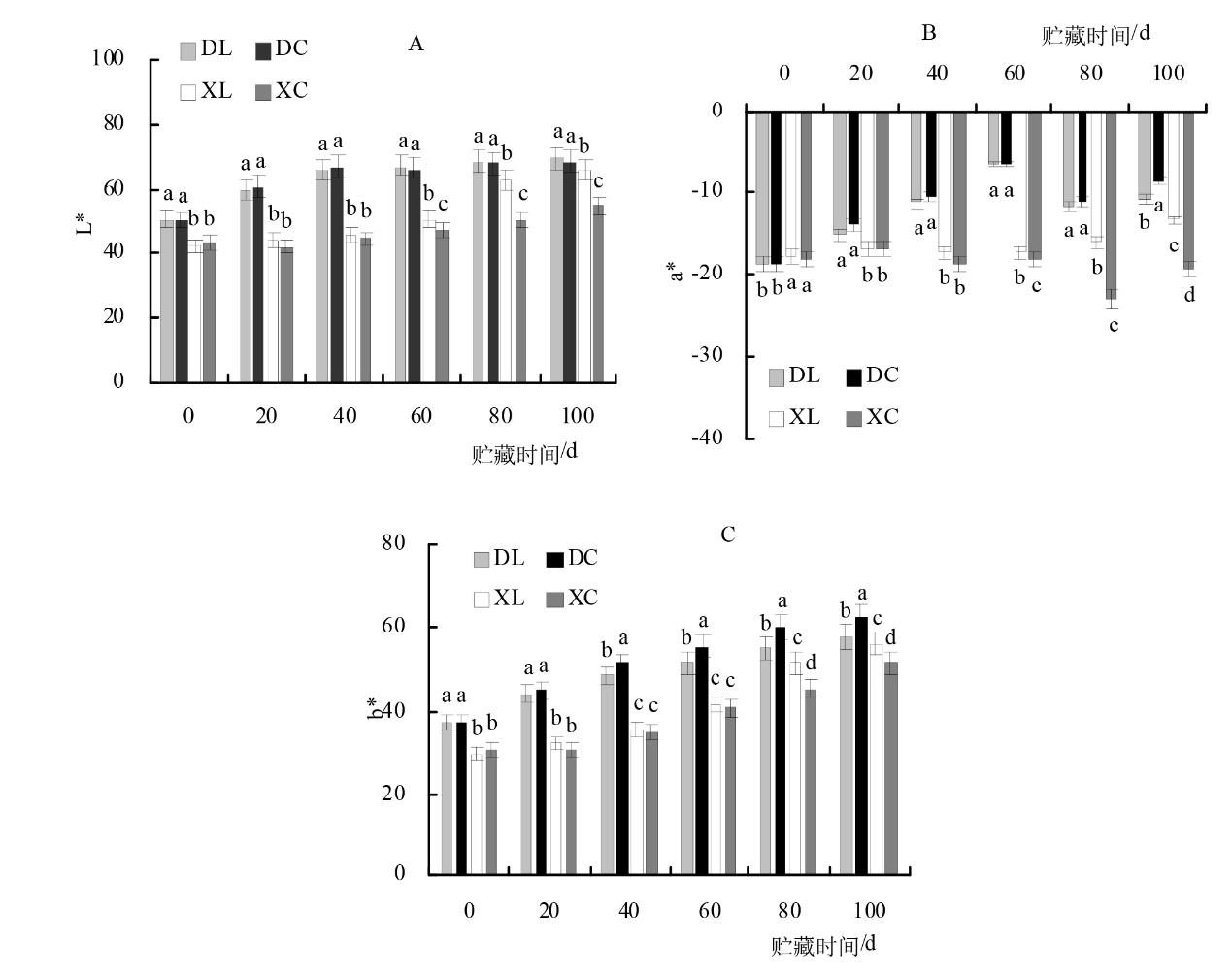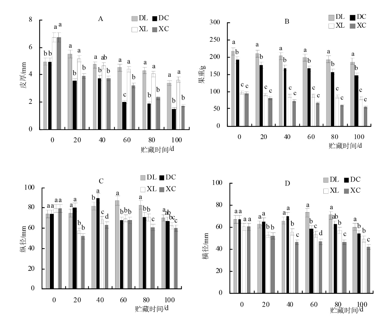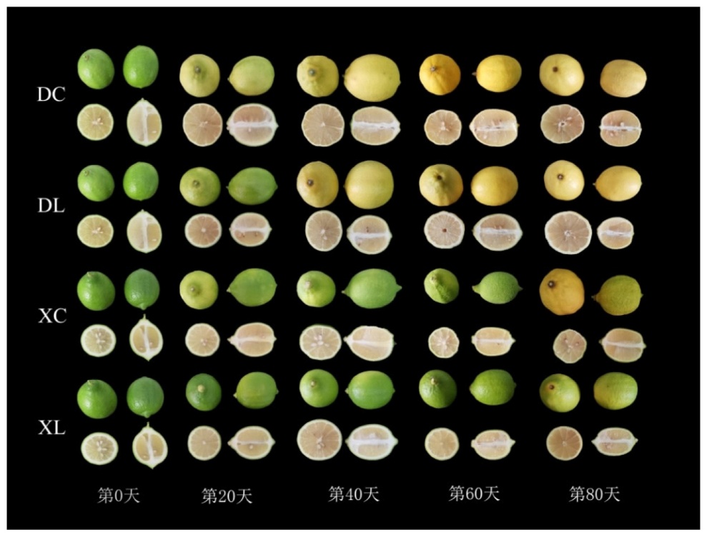Aiming at the problems of easy senescence, water loss and quality decline of ‘Yunning No. 1’ lemon after harvest, in order to clarify the suitable preservation scheme of fruits with different maturity, this study investigates the effect of BC coating on the storage quality of lemon fruits at different maturity stages, and provides a theoretical foundation and practical methods for preserving lemons. Using ‘Yunning No. 1’ lemons at 80% maturity (DL) and 50% maturity (XL) as materials, fruits with uniform size and healthy surfaces were selected, BC coating was applied to lemons at different stages of ripeness, and samples were taken every 20 days. Measurements were taken for fruit weight loss rate, fruit weight, peel thickness, longitudinal diameter, transverse diameter, color difference, total soluble solids (TSS), and titratable acid (TA).The results indicated that for the same storage period, the L*, a*, and b* values of 80% maturity were significantly higher than those of 50% maturity, the uncoated 50% maturity (XC) exhibited wrinkled and hardened peel at 60 days, with severe wrinkling observed at 80 days; the XL treatment group significantly delayed the yellowing and wrinkling of lemon peel during storage, color change began on the 80 days of storage without any wrinkling observed. In the DC treatment group, fruit peel yellowed at the 20 days of storage and showed slight wrinkling at the 60 days, in the DL treatment group, fruit yellowed at the 40 days of storage, with the peel remaining glossy and free of wrinkling throughout the storage period. At 100 days of storage, the fruit weight loss rates for the XL and DL treatment groups were 13.12% and 17.35%, respectively, both lower than those of the XC and DC treatment groups; the soluble solids content of the fruit fluctuated between higher and lower levels, after 80 days of storage, the titratable acid content of the XC and XL treatments was significantly higher than that of the DC and DL treatments, reaching 9.61% and 9.34%, respectively, after 100 days of storage. During storage, the TSS/TA showed a decreasing trend across all four treatment groups. Therefore, in actual production, lemon fruits can be harvested when they reach 80% maturity and treated with a BC coating agent to extend their storage life and maintain good quality.