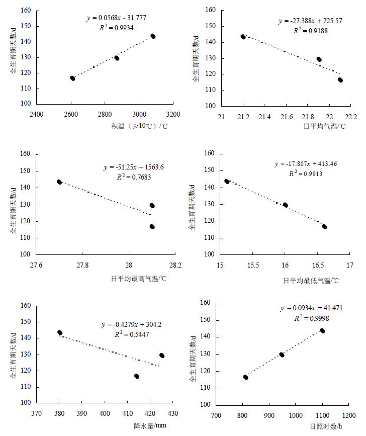 | 播期处理 | 全生育期天数/ d | 积温(≥10℃)/ ℃ | 日平均气温/℃ | 日平均最高气温/℃ | 日平均最低气温/℃ | 降水量/ mm | 日照时数/ h |
